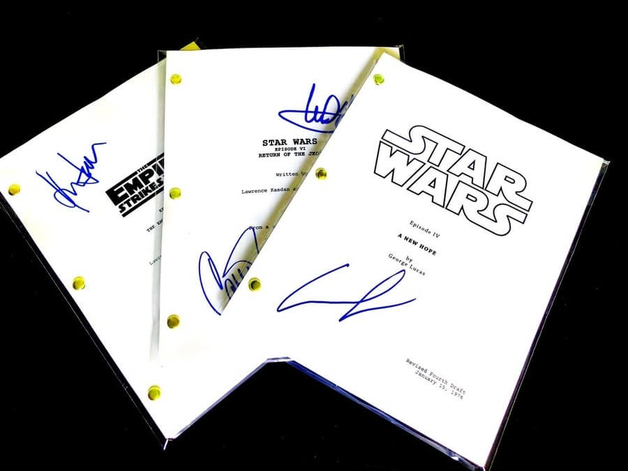 Por ejemplo puedes comprar el guión de la película: Harry Potter y la piedra filosofal, en la portada encuentras los autógrafos de los actores principales: Emma Watson, Daniel Radcliffe, Rupert Grint y Tom Felton.